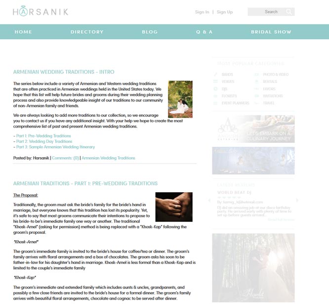 Our users told us they love the wedding traditions in our site, so we created a whole section dedicated to Armenian Wedding Traditions! If there are any Armenian Wedding Traditions that are not listed, send us the information and help us refresh the content used by so many brides planning their wedding!