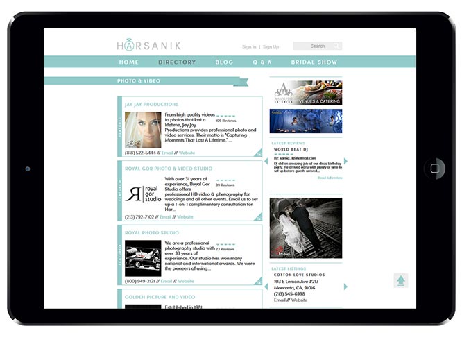 As we mentioned above, Harsanik's new layout and gorgeous design can now be accessed on your tablet and smartphone. In addition to the constant access to articles, wedding guides, and bridal stories, you can now even plan your wedding on the go. Find and call vendors while you're out and about, add or remove vendors as you meet with them...the possibilities are endless. Create an account with us, and you can access your favorites from any device.