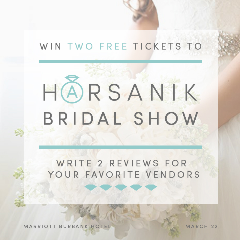 We look forward to hearing all about your experiences with our incredible vendors. And we can't wait to see you at our show! The 2015 Harsanik Bridal Show will showcase the most talented wedding vendors in Southern California, including photographers, videographers, DJs, celebrity florists, caterers, and more! Join us on Sunday March 22 at the Marriott Burbank Hotel from 12-5 pm for the best bridal show of the season!